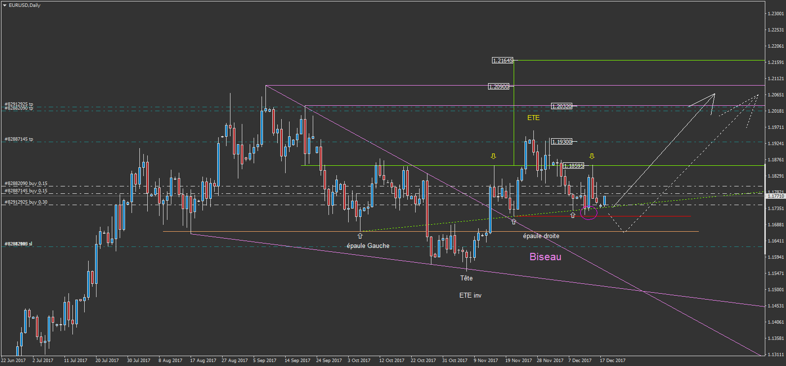 EURUSD, toujours en position. j'espérais l'objectif des 1.18595 pour se mardi 19/12/2017, mais bien que proche, on a un décalage pour y parvenir.