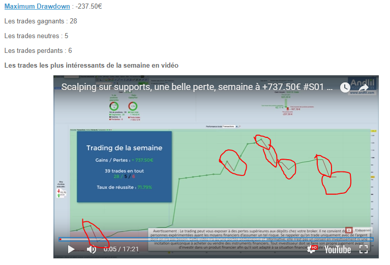 Le plus marrant, c'est qu'il annonce 6 trades perdants alors qu'il y en a 7 sur sa courbe !!! (il y en a 2 de suite au milieu et 2 à la fin je les ai entourés maladroitement!) Décidément il n'y arrivera jamais