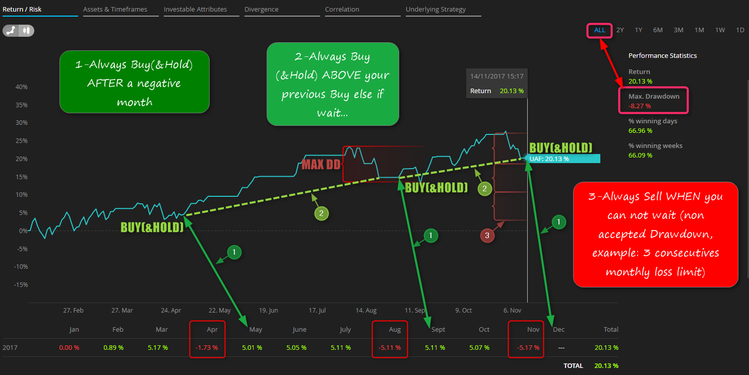 l'objectif HABITUEL mensuel pour recouvrir la perte. Donc l'investisseur pourrait se dire, ici, à -5% mensuel c'est LE bon moment d'investir ou renforcer UAF. Pour autant,