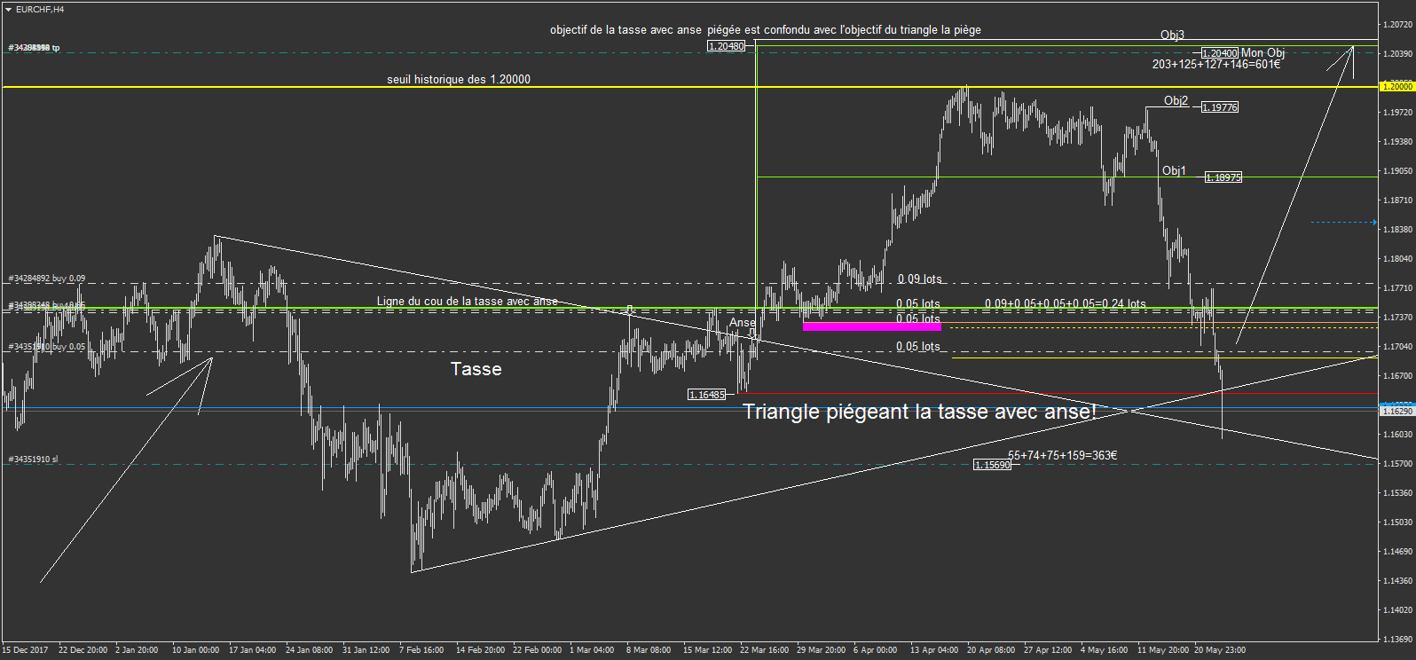 l'EURCHF, le sénario de la tasse avec anse avait raté, mais je n'est pas été stoppé (pour le moment), car j'ai considéré un nouveau scénario.