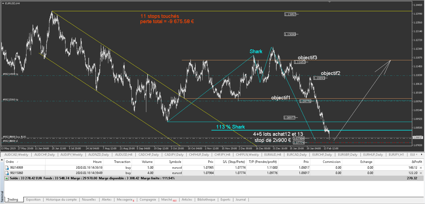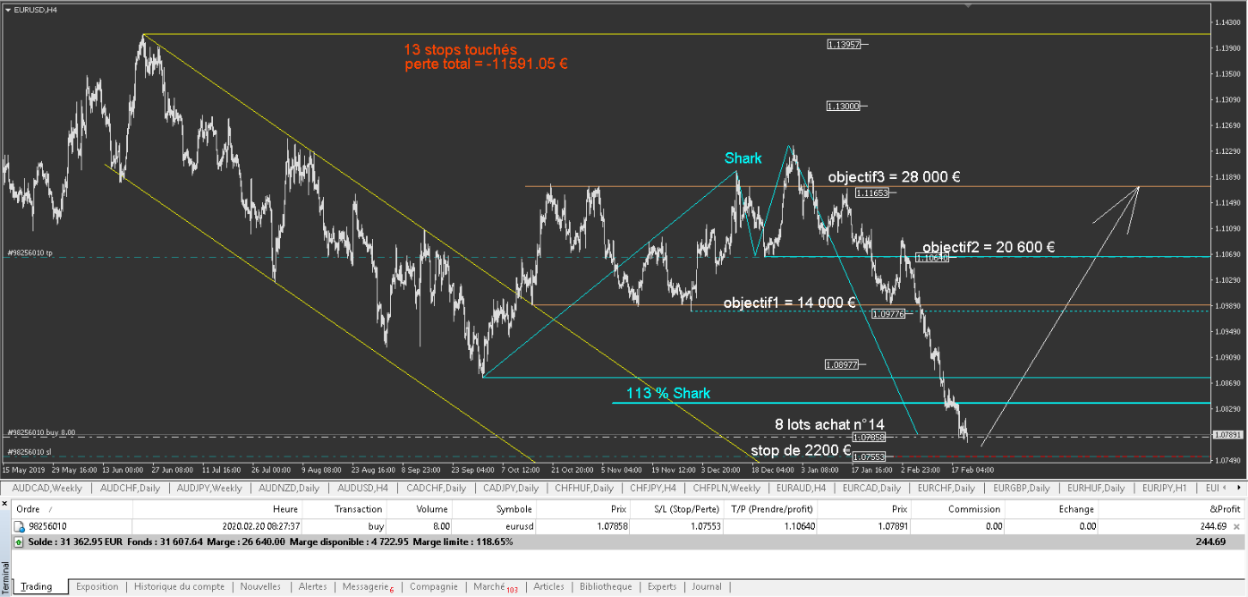 stoppé sur EURUSD, la suite. j’aurais acheté tous les niveaux, on arrive à limite basse maximum de ma configuration. plus bas , et celle ci sera définitivement invalidé.
