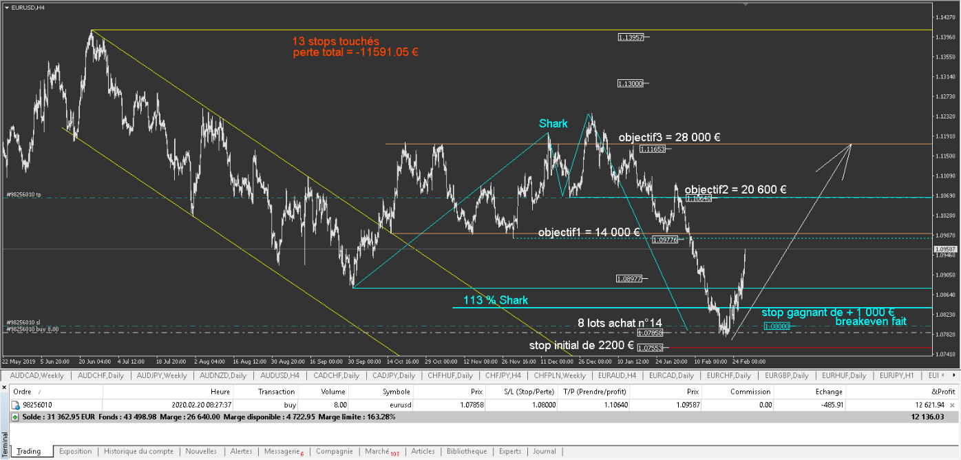 Je repart dans l'aventure acheteuse sur cette EURUSD malgré mes dernières péripéties, en espérant toujours finir positif une fois cette configuration terminé.