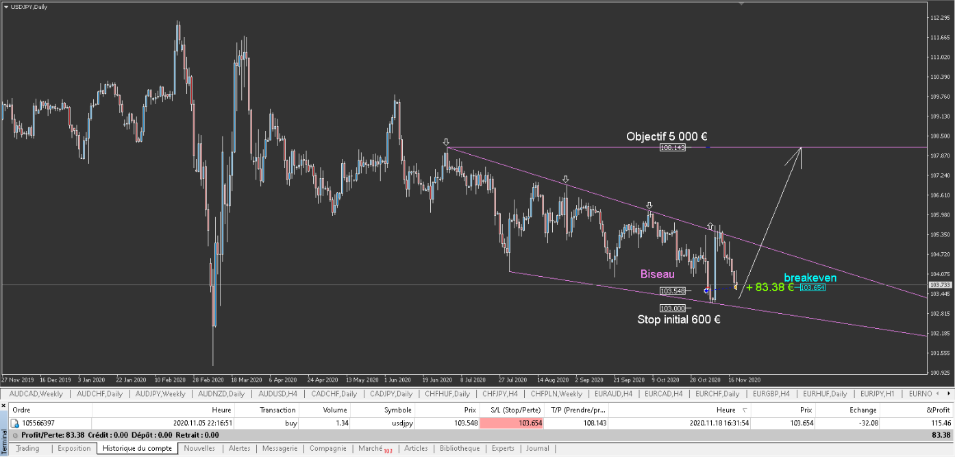 Sur USDJPY, oui, mon breakeven à été touché à 115.46 mais avec le swap ca ne ma fait qu'un gain de 83.38 €.