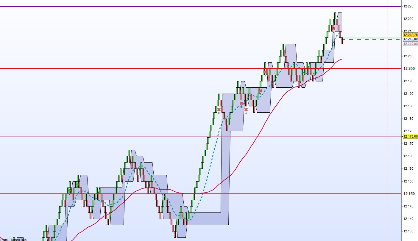 En milieu de séance malgré un trading très prudent je me fais ouvrir plusieurs fois mais je coupe rapidement. La tendance commence à être hésitante avec un bon UP (comme prévu au brief) Mais ensuite commence une belle baisse donc je prend un certains nombre de shorts.