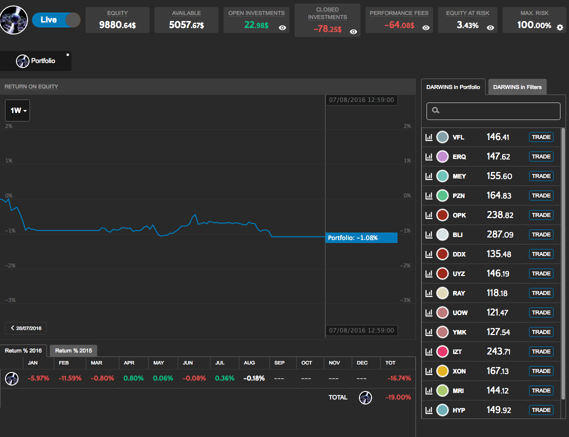 Je me suis absolument gardé d'investir sur des Darwins type HBZ qui pour moi sont des mirages voués à se dérégler à un moment ou un autre et partir en vrille, car vraisemblablement suroptimisés et mécaniques, non humains, durs à s'adapter à des changements de marché. J'ai donc choisi des Darwin aux allures de trading discrétionnaire, qui avancent avec plus ou moins de difficultés et de pics et vallées.