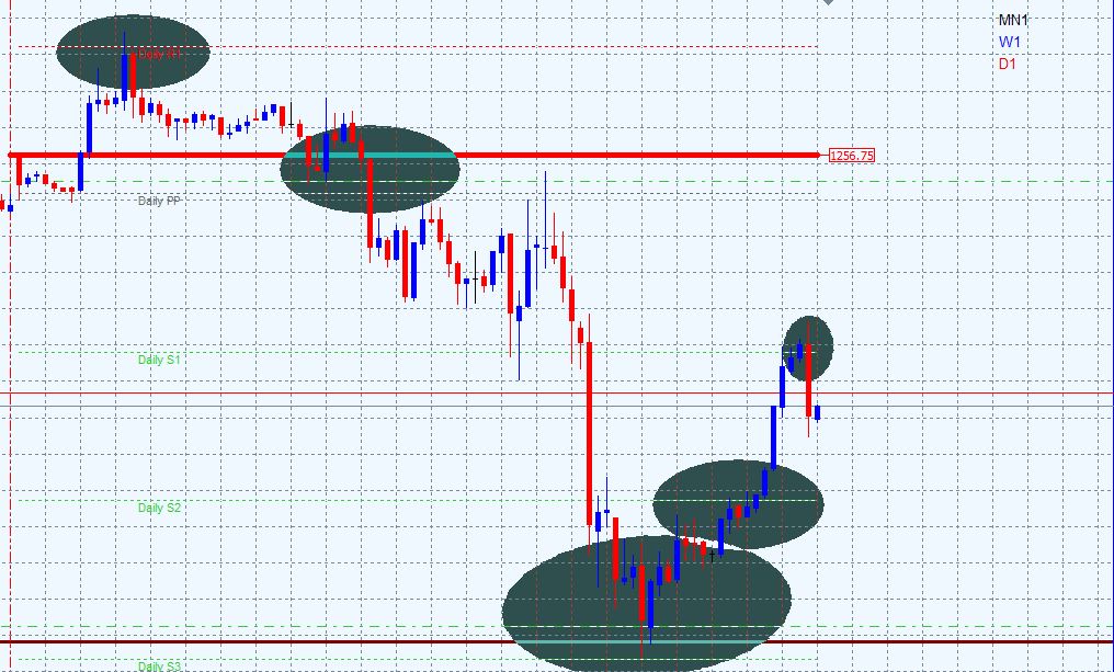 bon et bien ce matin le prix monte j’espère au moins que l on va aller jusqu’à mon "sell stop" à 1269$ et nous serons arrivé à mon PP mensuel et la après c est ou on va chercher S1 et j ai tout gagné ou on va chercher R1 et j ai tout dans le c.... mais bon seul les initiés savent a peu près ce qui va se passer je vais me contenter de voir ce qui ce passe et essayer de comprendre ça sera déjà pas mal!!!