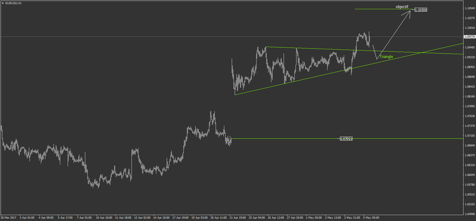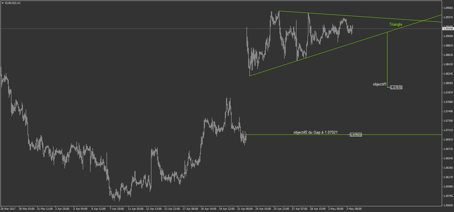 Avant le FOMC de 20h en ce mercredi 03/05/2017 et bien l'EURUSD est toujours dans son triangle symétrique. seul une cassure baissière me donnera une idée baissière avec pour but de reboucher le gap. mais l'objectif1 à changé et est plus court à 1.07970