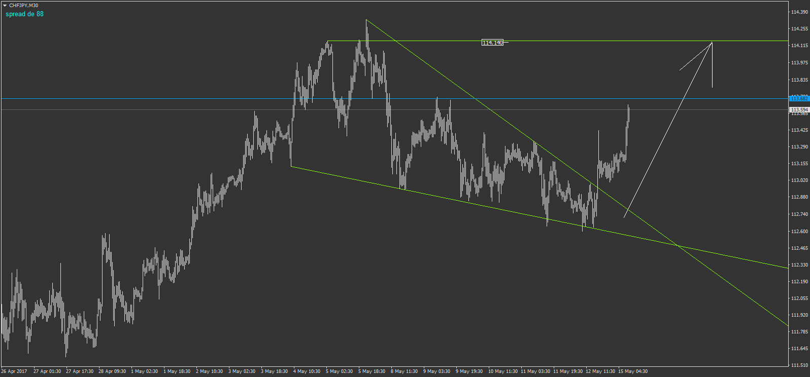 Sur le CHFHUF, après avoir piégé le premier biseau, en voici un nouveau qui à lui, bien cassé à la hausse et l'objectif théorique est à 114,330 mais avec un objectif raccourcit à 114,140