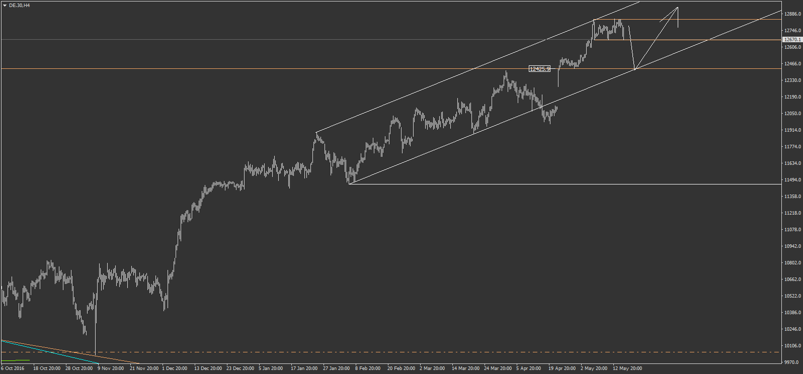 sur le DE.30 (Dax), j'imagine une baisse pour retoucher un ancien support avant de redécoller. il s'agit du support blanc qu'on avait cassé à la baisse par le passé avant de contrer cette cassure pas un retournement haussier. selon moi on doit revenir tester cette ligne avant de repartir à la hausse. ce qui fait qu'il y a de la place pour la baisse. un autre point à noté, c'est la parallèle de ce support, qui trouve 2 points, dont le dernier n'est autre que le plus haut du dax dernièrement formé. se point d'appuis est un signe supplémentaire pour nous rappeler le support dont provient sa parallèle