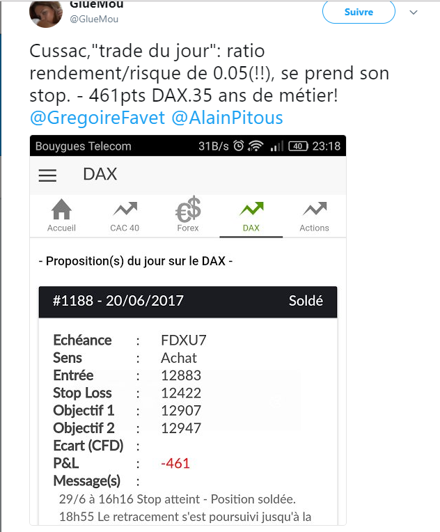 Et j'ai été gentil avec lui car je n'ai pas intégré le spread sur le cac et que fin juin le trade du jour est même passé carrément négatif après avoir perdu plus de 600 points sur le dax en 2 jours (je mets en copie le trade fatal ou il perd 461 points d'un coup avec le lien https://twitter.com/i/web/status/880538504916344832). ça fait cher la plaisanterie.
