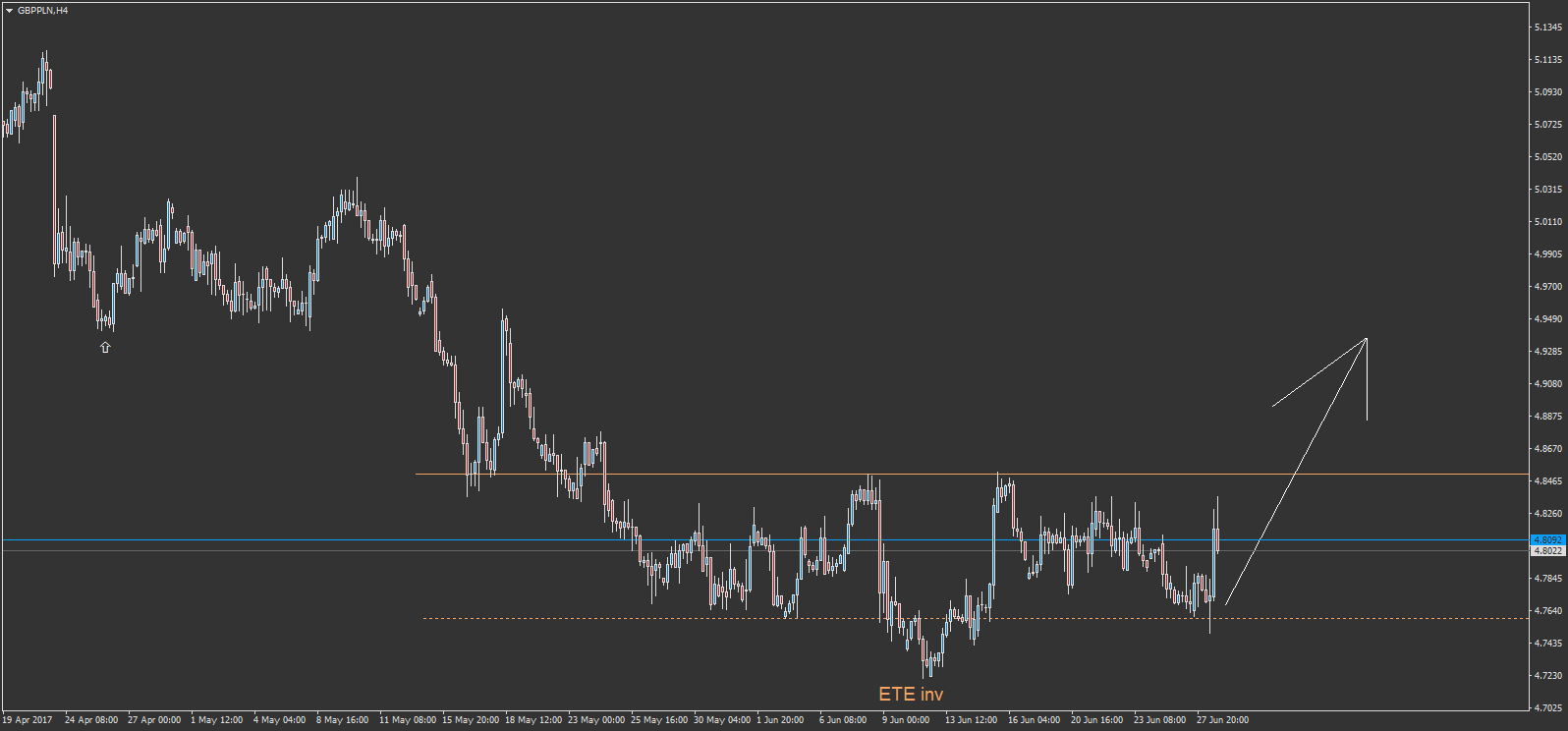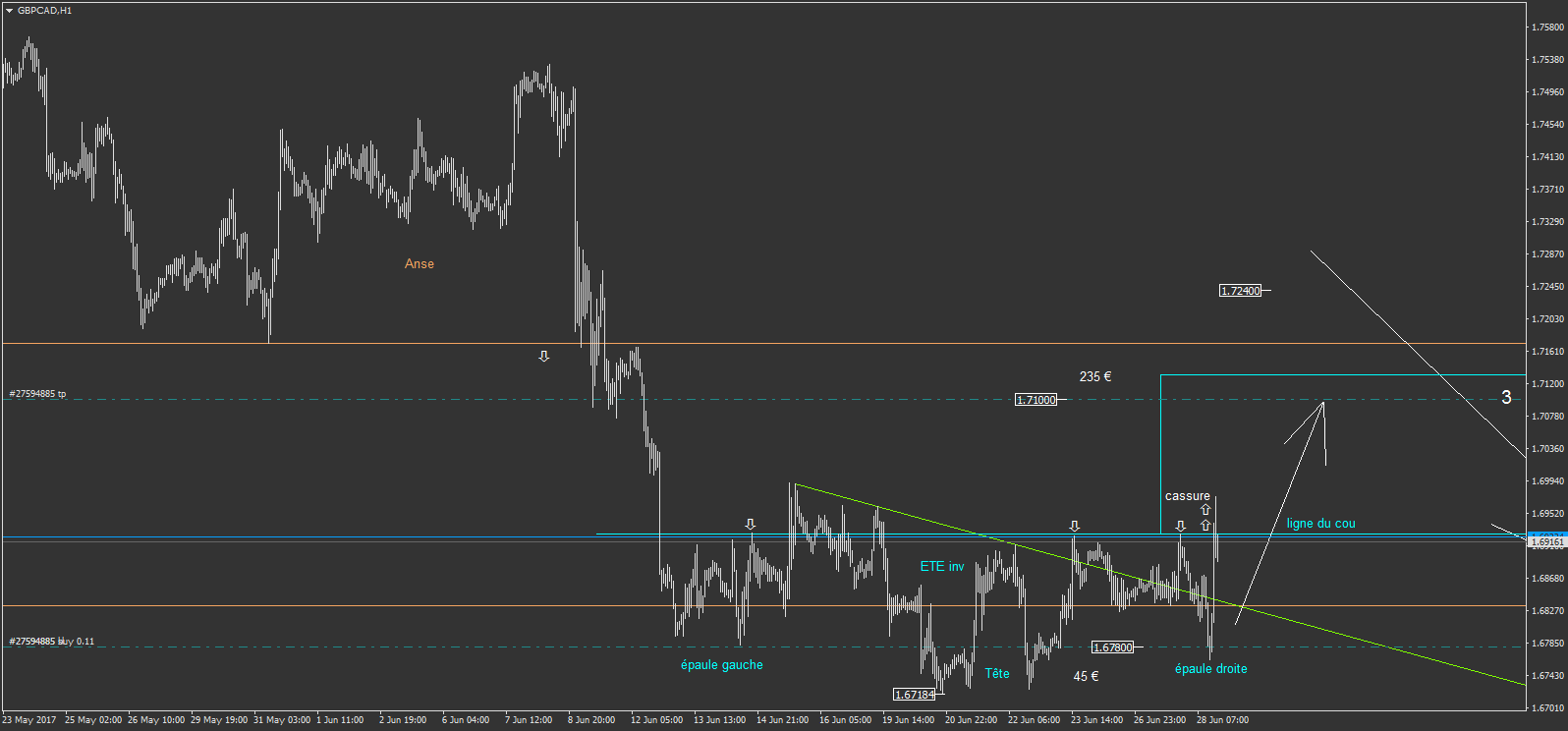 -sur le AUDUSD pour +193 € de gain. mon objectif initial était la ligne bleu foncé, mais je l'ai écourté après avoir anticipé avoir trouvé justement un point d'entré à l'achat sur ce niveau. mais je n'ai pas tenté ce point d'entré à l'achat...