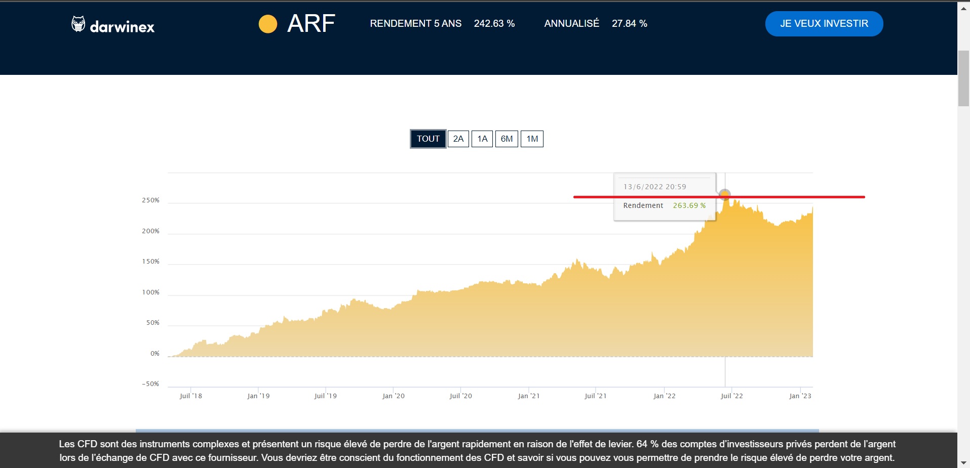 Le Darwin ARF est en Drawdown depuis le 13 juin 2022. Cela fait donc 8 mois que ceux qui ont acheté ce Darwin cet été, non seulement ne gagne pas d'argent mais en plus, subissent des pertes latentes :