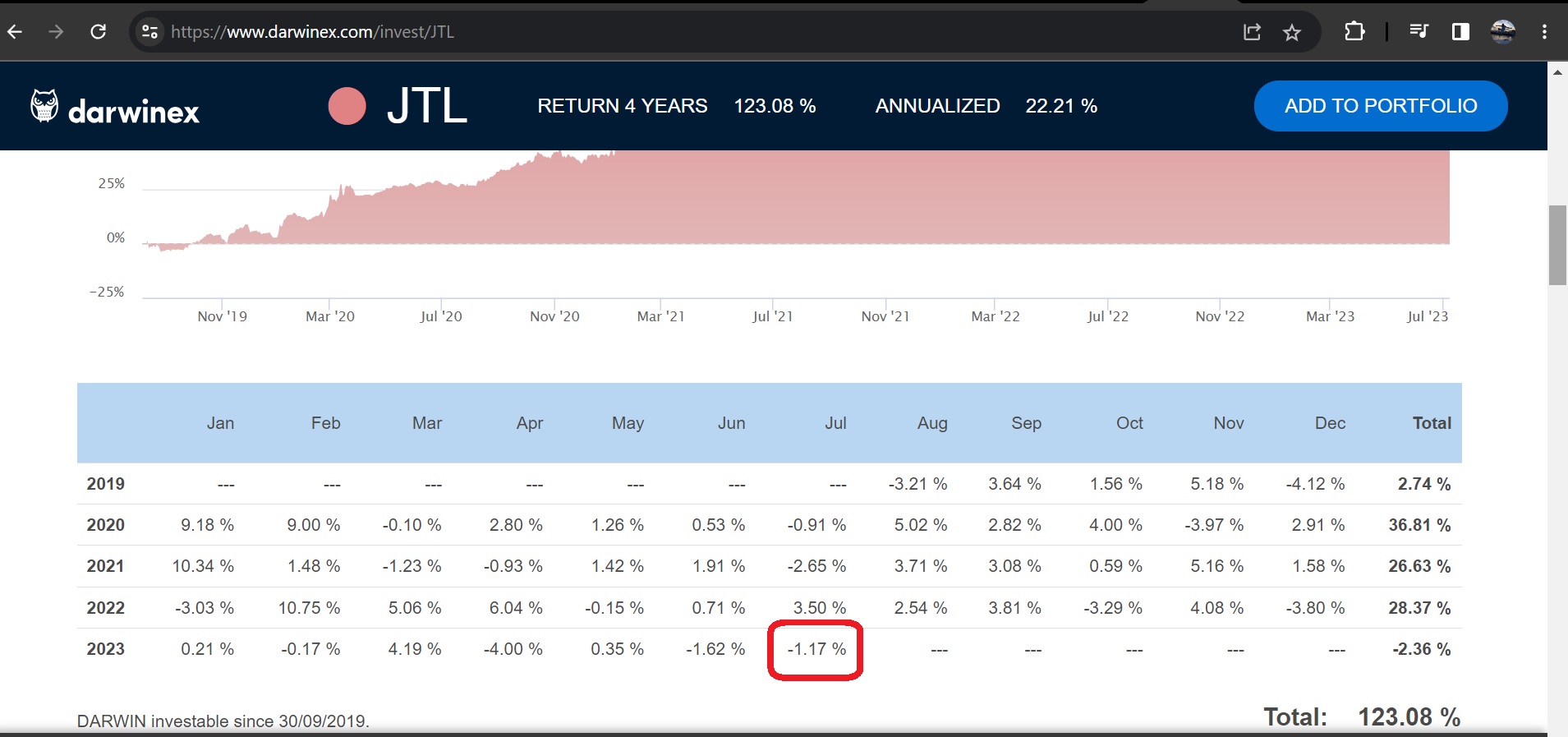 Mention spécial pour JTL qui avait le Drawdown le plus faible à -5% jusqu'alors et qui se rapproche dangereusement de -9% et donc peut-être que bientôt plus aucun Darwin n'aura un Drawdown à 1 chiffre :
