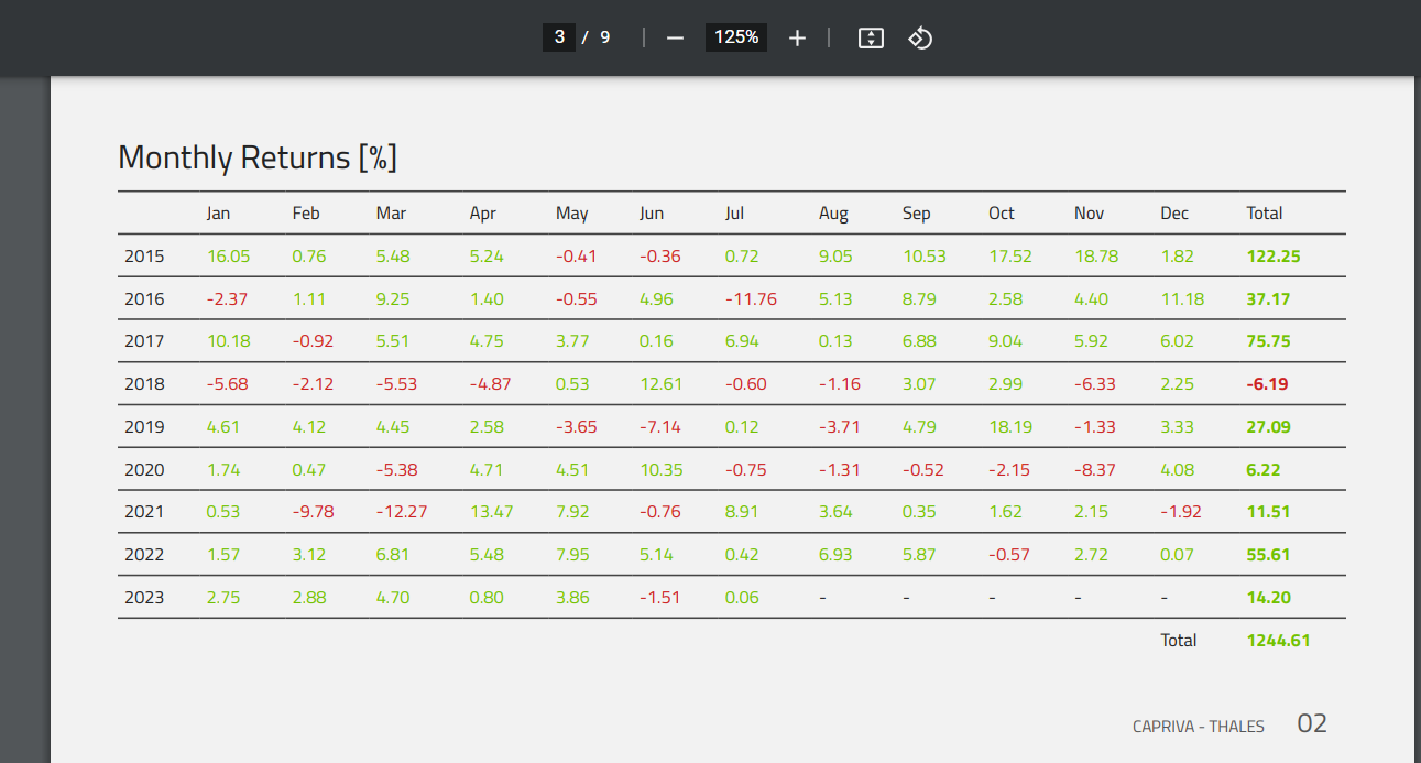Le début d'année 2023 est très compliqué pour le suivi de tendance, de nombreux très bons gestionnaires n'ont pas réussi à performer comme JTL ou d'autres pour ne pas les citer. Nous ne somme pas du tout inquiet pour la suite puisque l'année 2022 a été belle au global (+23%) et que 2023 est encore long avec un début d'année pas si catastrophique au final (-8%).