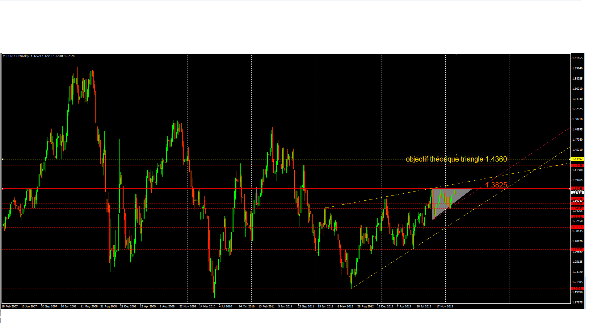 -Un break de cette zone en daily avant cette periode n'invaliderait pas la hausse mais annulerait le triangle au profit d'un double ou triple bottom pour un objectif théorique moyen terme similaire (1.4350)