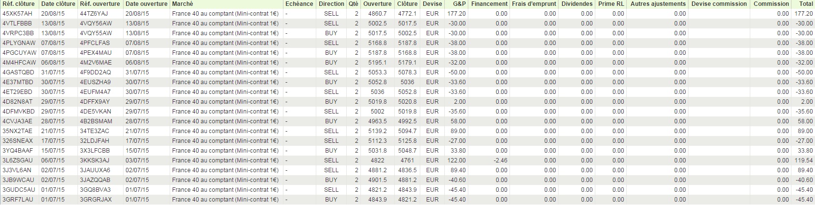 Ce mois de juillet a été bon pour la stratégie, voici les résultats:Voici le rapport détaillé des poisiton de ce derniers jours:J'ai crédité 1000€ sur un second compte ProRealTime CFD via IG sur lequel je vais faire tourner une version plus active de cette stratégie dont les backtests sont intéressant. Je vais ouvrir une nouvelle file de discussions pour présenter cela.