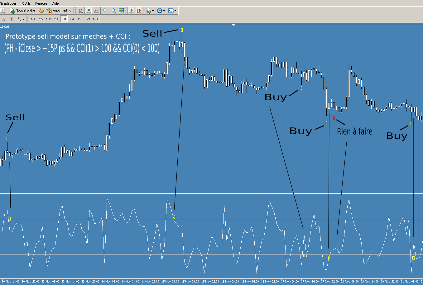 Comme à vu d’œil sur le graphe je ne vois rien, je regarde en H1, voici ce que cela donne :