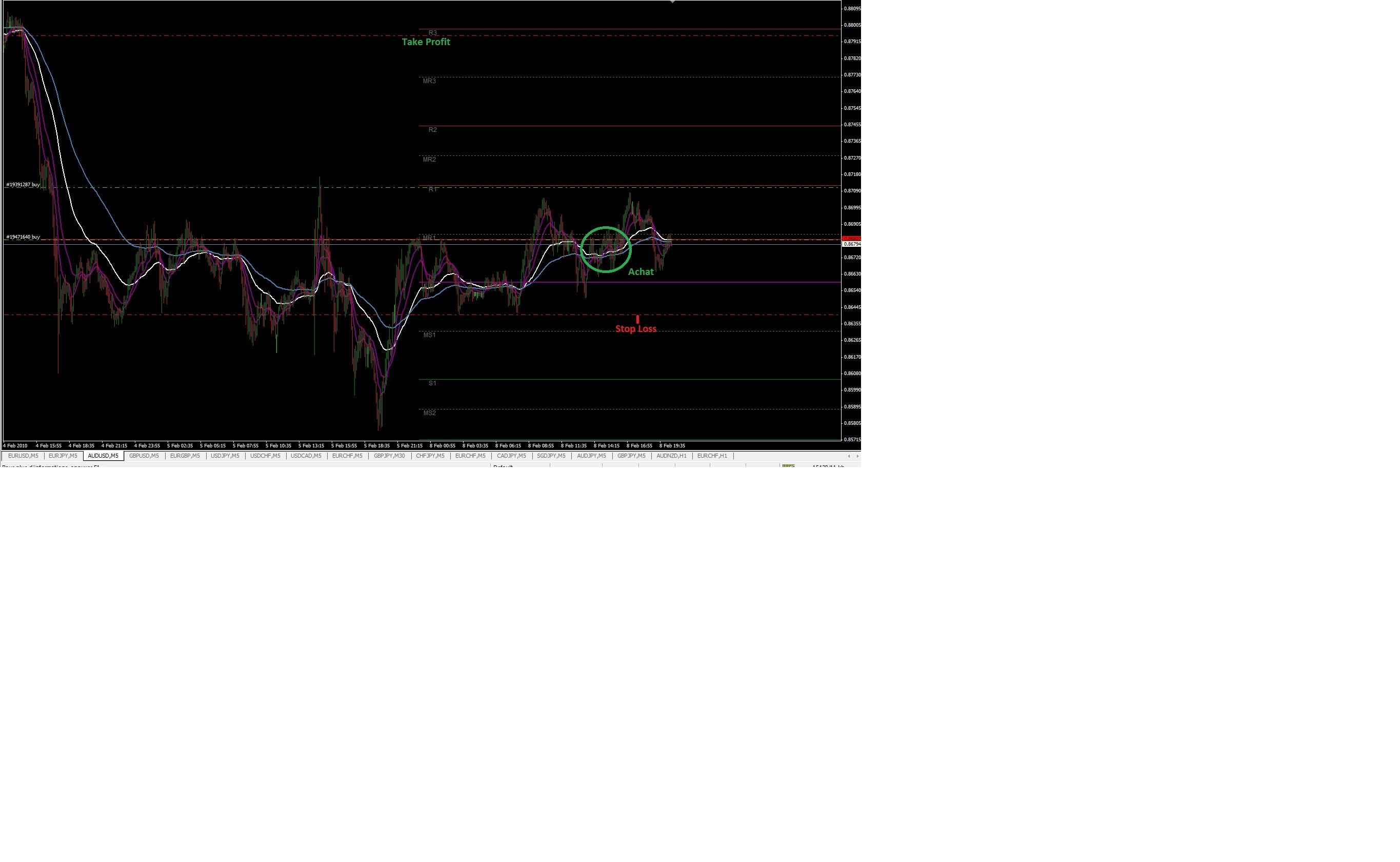 J'ai pris position à l'achat sur l'AUD / USD avec 0.02 lot suite au franchissement à la hausse du point pivot du jour et des différentes moyennes mobiles exponentielles étudiées, puis d'un reteste de ces outils, pariant sur un éventuel pullback (Prix d'entré: 0.8682 Stop Loss: 0.86405 Take Profit: 0.8795) pour aller chercher la 3ème résistance calculée à partir des points pivots du jour.
