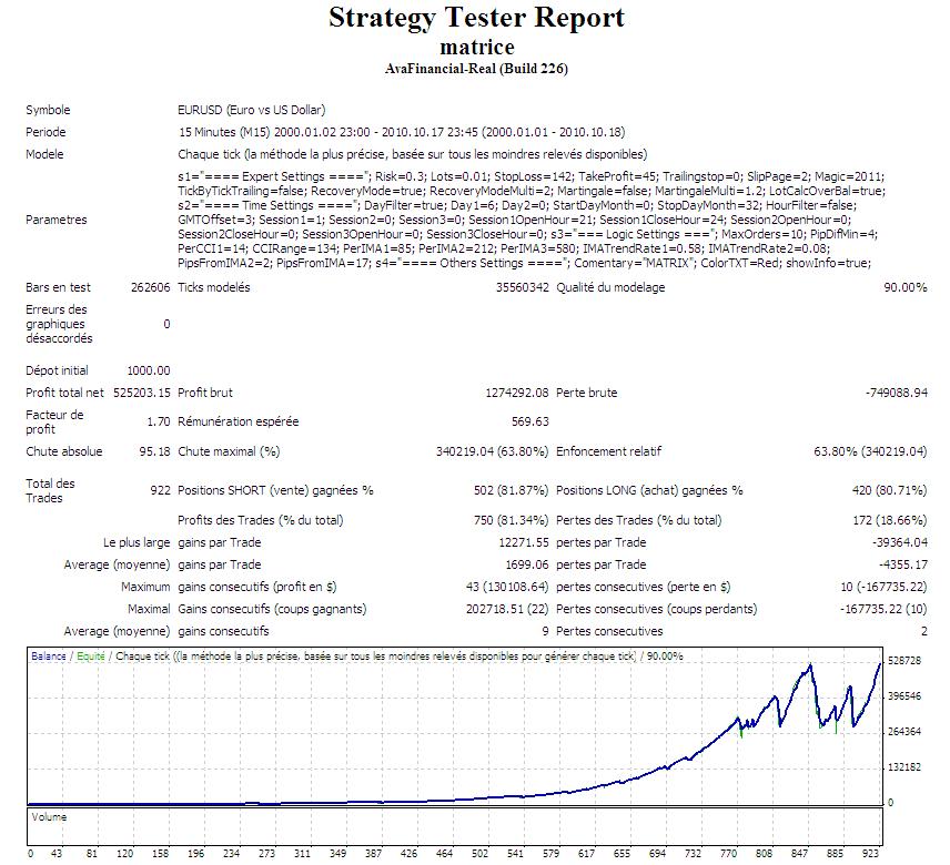 donc si c'est le bon système; je vois un stop à 142 et magic number 2011 (j'ai vu sur les posts précédents des stops à 100 et magic number 5555 ??); on remarque que la progression surtout en fin de parcours n'est pas tranquille (on perd la moitié de son capital).turfer a écrit :Voici un backtest sur 10ans...
