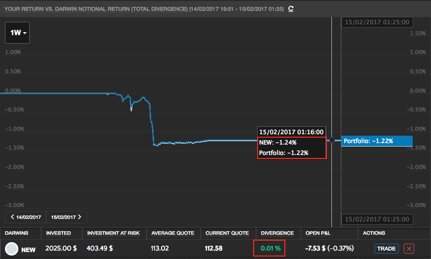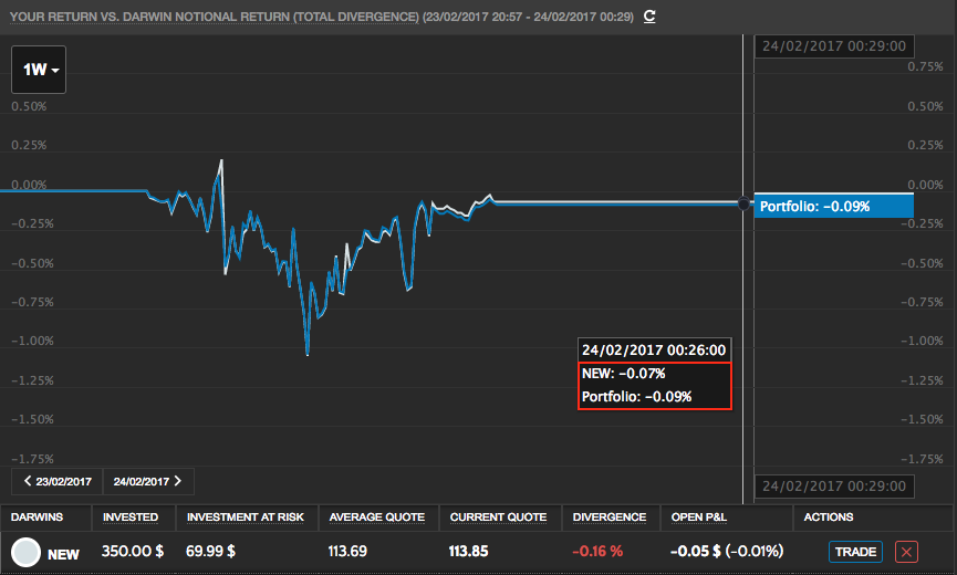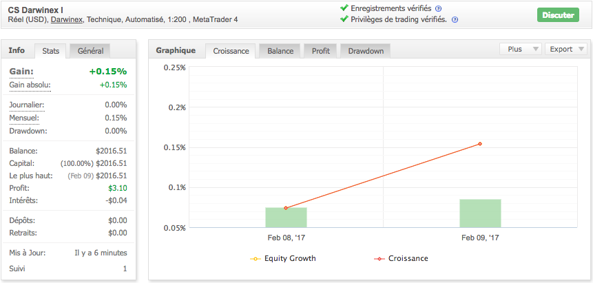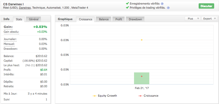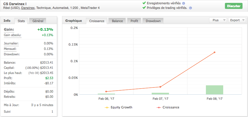 Bon j'ai réajusté mon investissement sur mon Darwin NEW pour rester dans un risque stable vu qu'actuellement Darwinex applique un levier de 1:6 entre mon compte et mon Darwin.