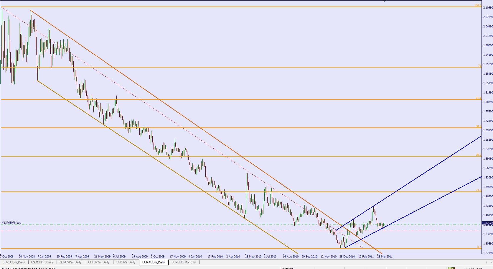 EUR/AUD ça se passe bien, on suit la tendance moyen terme, on est bien sortie de la tendance baissière long terme et je pense qu'on a un beau potentiel de correction.
