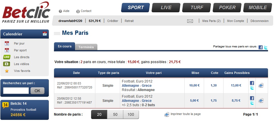 Hier sans surprise l'Espagne nous a mis out (minable l'équipe de France). Je passe donc la barre des 10% de profit par rapport à mon capital depuis le début de l'Euro.