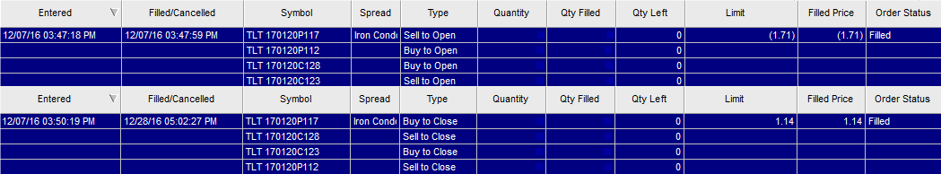 L'Iron Condor de Strike P112/P117/C123/C128 et d'échéance 20 janvier, ouvert le 7 décembre à $1.71 a été clôturé hier à $1.14 pour un rendement de 17% en 3 semaines.celtinvest a écrit :L'Iron Condor, une stratégie que j'aime particulièrement pour jouer les ranges: http://www.celtinvest.com/iron-condor