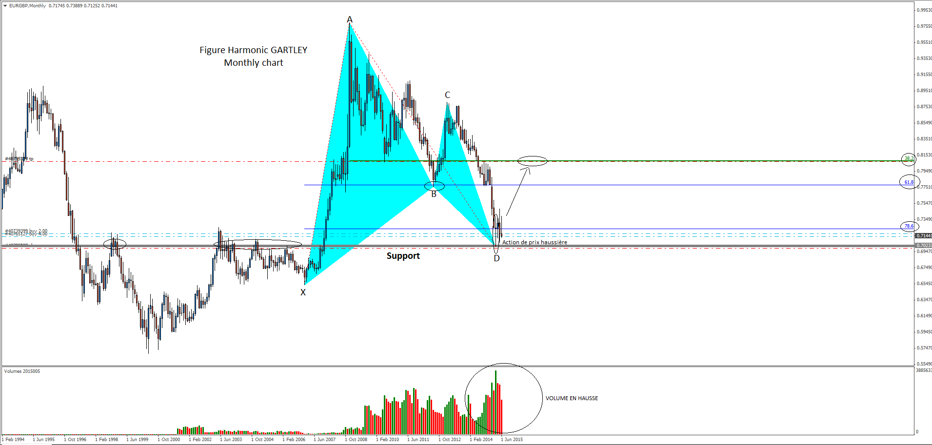 Figure harmonic "Gartley" avec bonne réaction des prix, un bon volume (tick volume) et une bonne zone de support.