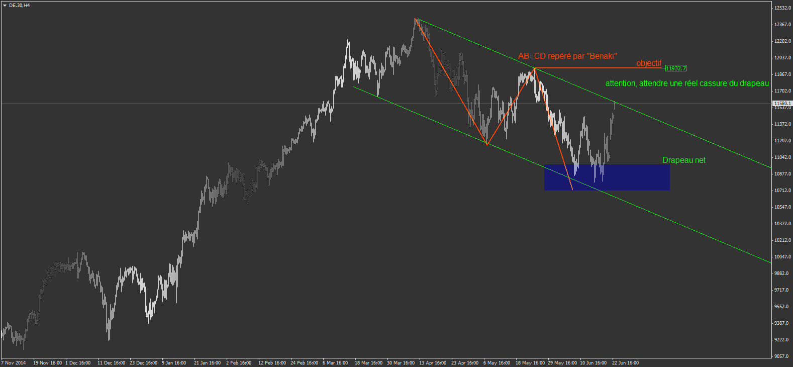 pour le dax, comme on a franchie légèrement hier le drapeau, je suis frileux pour la baisse. cela dit, à l'heure ou j'écris le drapeau a été réintégré, donc la cassure n'est pas confirmé.