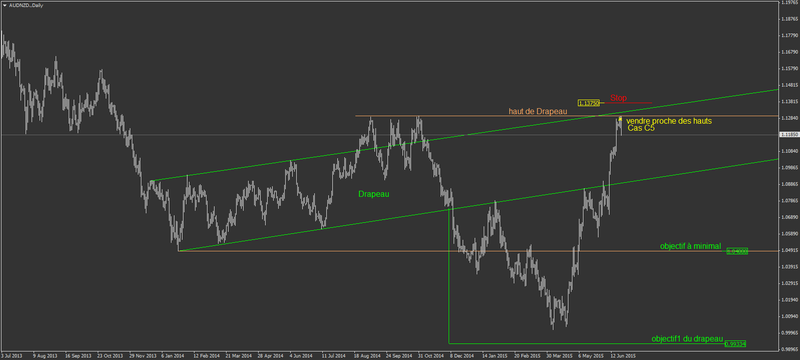 mon cas C5 consiste à vendre sur un retour sur le haut d'un drapeau. stop au dessus des hauts du drapeau. a condition de n'avoir pas encore réalisé l'objectif du drapeau suite à ca cassure. juste, là, on est allé assez proche de l'objectif sans le réaliser. la ligne marron peut servie d'objectif