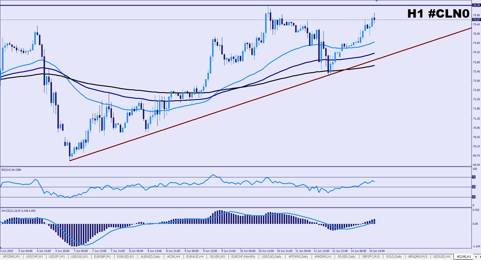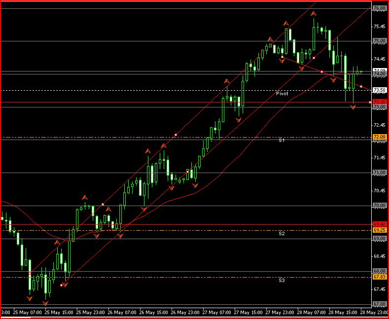 Techniquement on est dans une journée difficile il y a plusieurs résistance la veille trenligne haussier qui a avorter et la résistance 75.50 qui c est crée en aout 2009 et qui fonctionne des que on se trouve dessue ou dessous . Sur le rsi on arrive sur le 50 donc pour moi il vas falloir que les acheteurs se crache dans les main pour faire exploser . Perso je pense que mon trad long et a l abrie du ajourner pas très claire .