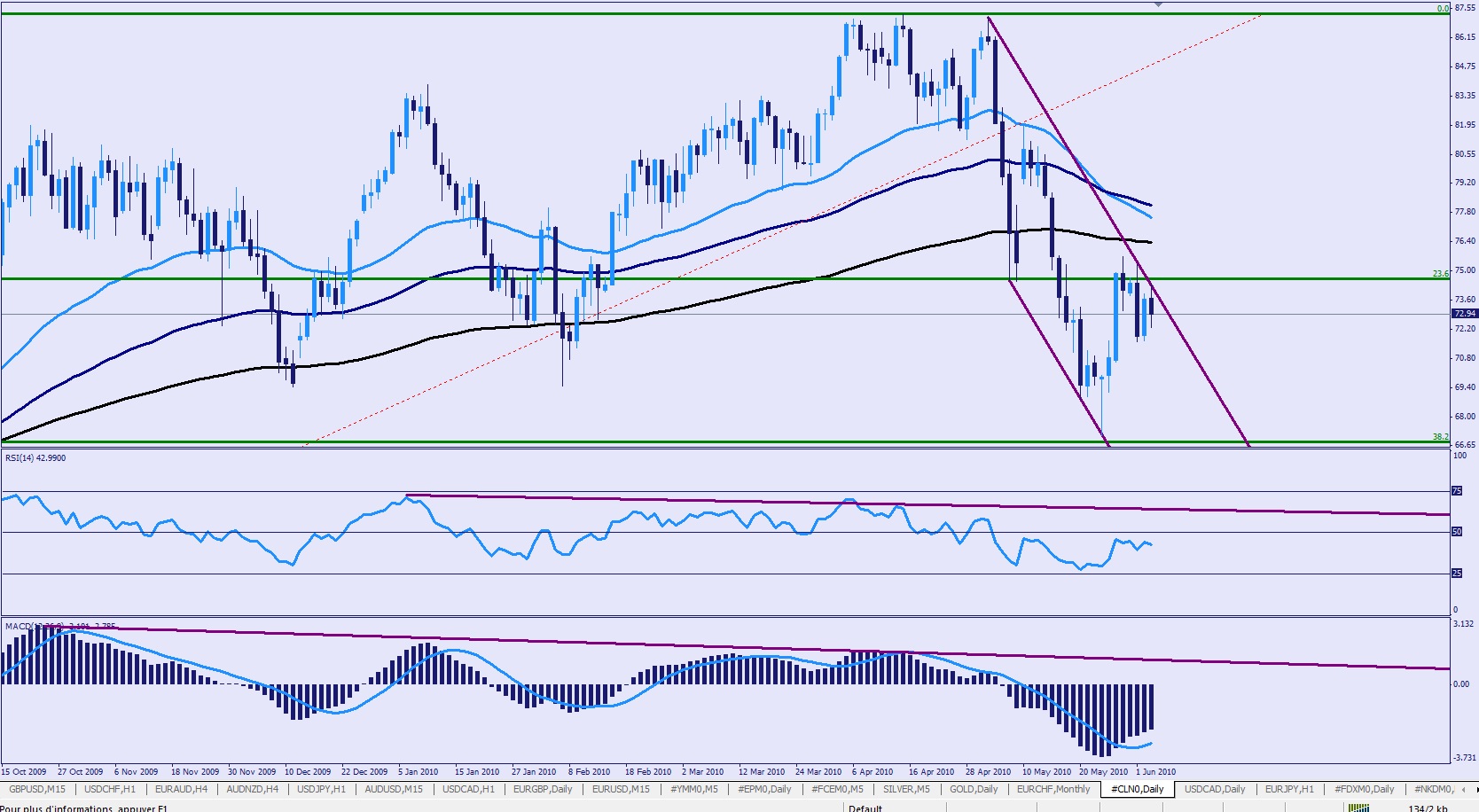 Ok abaz perso je suis analyse sur graphe Daily par se que je me sens plus allaise comme sa, deux même si je ferme mes position sur échec a pas franchir les plus haut ou plus bas de la veille j essai de trader le brut sur des différences de prix importante 5$ 10$ voir plus si l occasion se présente .pour moi cette paire et a 25% fondamentale sur l économie générale et a 55% sur l économie pétrole ( stock , utilisation de capacité, marré noir ,catastrophe naturel ,ext ext ). Et 20% sur la corrélation euro /$ économie mondiale et corrélation €/$ pote pour la vie .
