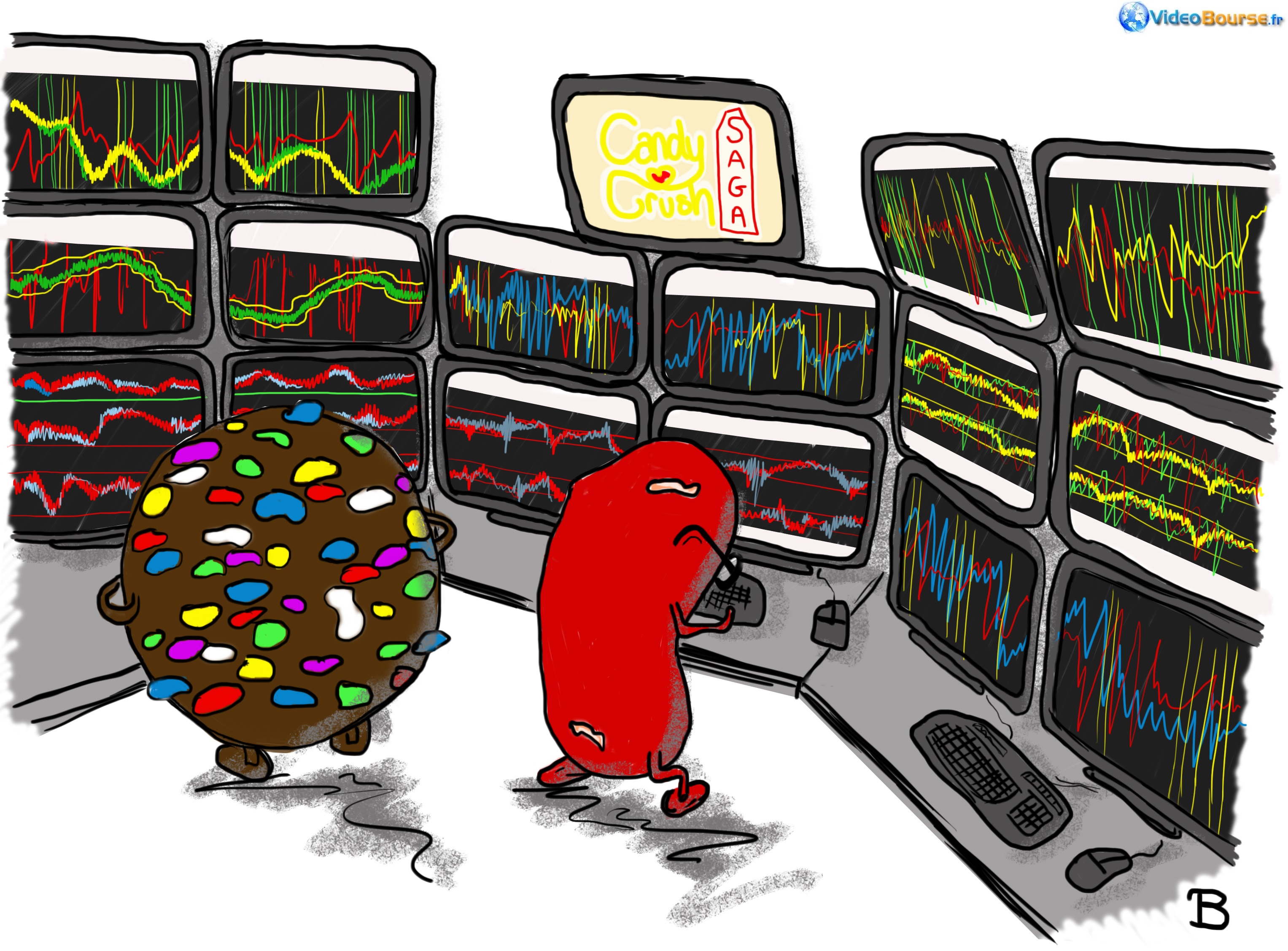 Le quotidien des bonbons de Candy Crush Saga depuis l'introduction en bourse de King.com. Dessin réalisé par Jade Boudon (contact: http://videobourse.fr/la-bourse.php ) pour VideoBourse.fr: