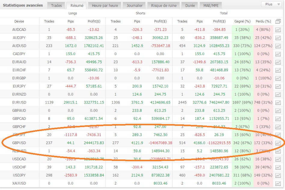 On peut voir dans le résumé des positions par produit que la perte s'est faite sur GBP/USD:C'est un produit qui a beaucoup bougé dans un même sens durant de nombreux jours ces derniers mois.