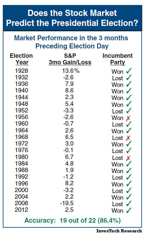 Si le marché performe 3 mois avant les élections c'est le parti en place qui est élu dans 86% des cas.