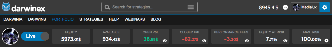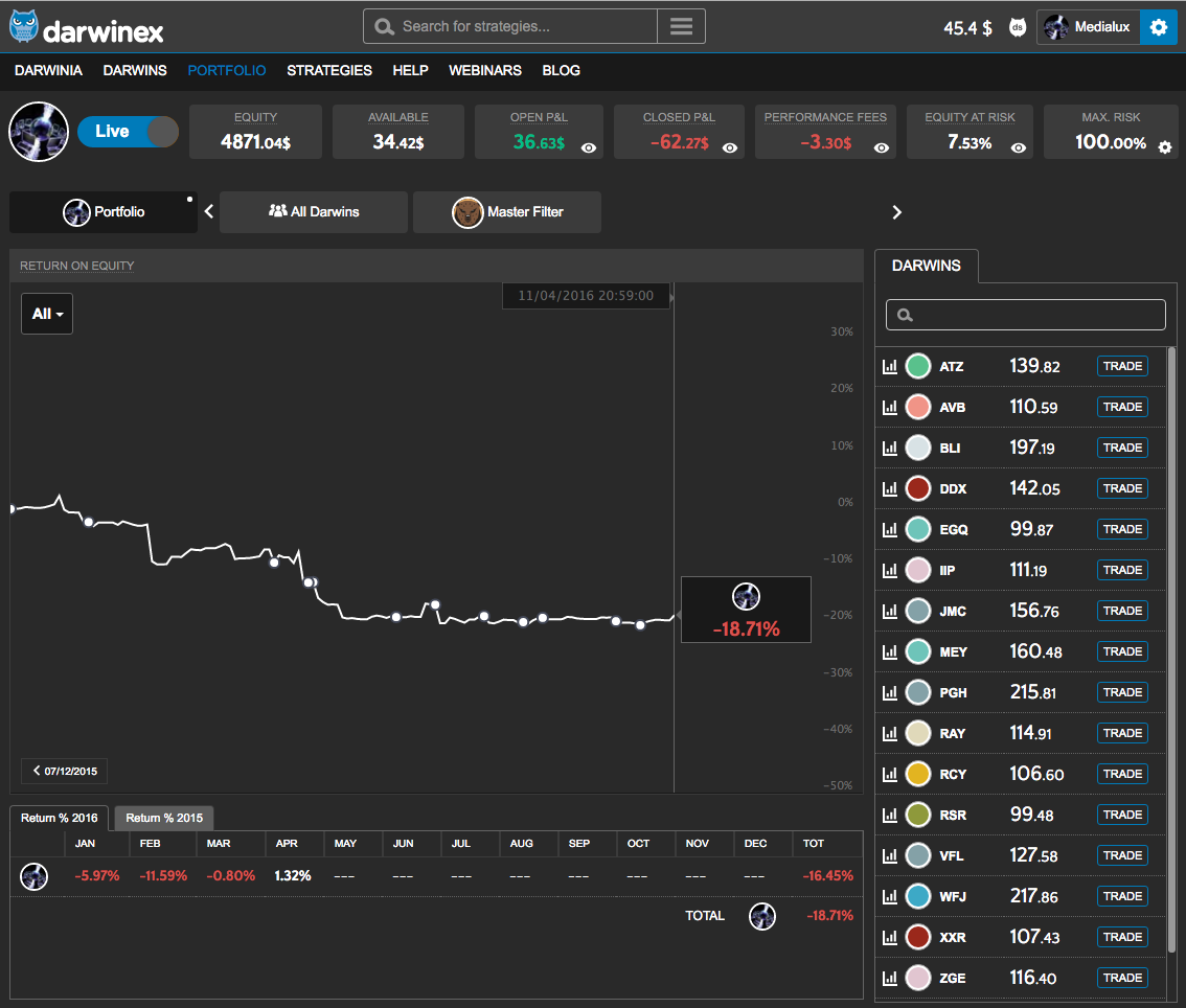 Pour le nombre de lignes, ton idée de jouer sur leur nombre et sur l'allocation de chacune, oui mais si tu veux jouer à fond le côté portefeuille démo (enfin réel) pour de futurs investisseurs, je pense qu'il serait mieux de répartir moins de darwins sur plus d'allocation fixe de type 10 darwins de 10% chacun en aum et en retirant les gains (ou ne pas réinvestir) trimestriellement par exemple. Enfin c'est juste une idée peut-être plus simple et plus claire dans l'objectif de démarcher des investisseurs. Tu peux je pense créer un second compte MedialuxPro par exemple.