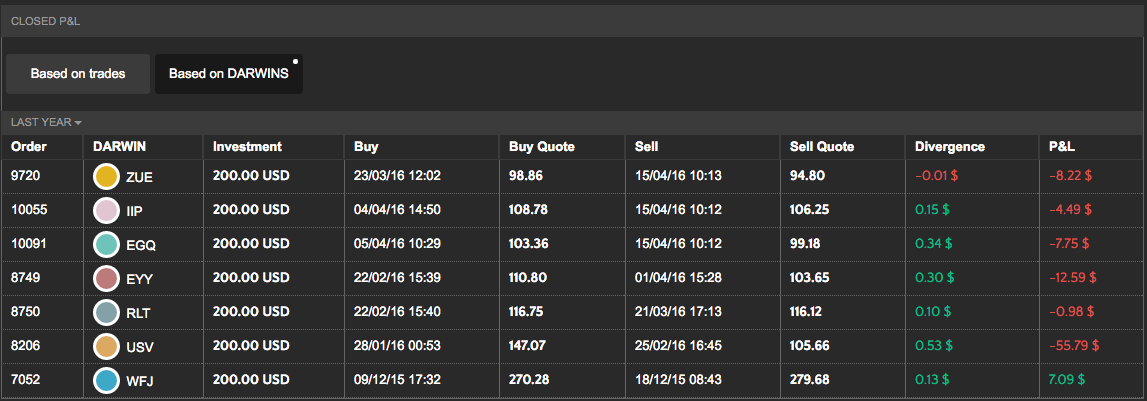 'RCY' fut une sorte d'achat 'coup de coeur', d'ailleurs j'étais son seul investisseur. Mais bon le trader a de l'expérience, un blog, etc. Donc j'avoue que j'avais plus acheté le trader que les métriques de son Darwin.