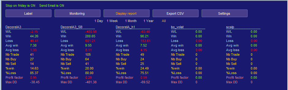 1/ Dans l'onglet REPORT du programme s'affiche une vue d'ensemble (wl,%w,%l,nb trade,...pf,DD) de chacun des EA/strat que vous utilisez, en fait je l'ai limité à 5 pour des raisons d'ergonomie, mais dans l'absolue il n'y a pas de limite et rien n’empêche de faire tourner 2 programme, 2*5 soit 10 EA/strat pouvant être suivies et analyser.