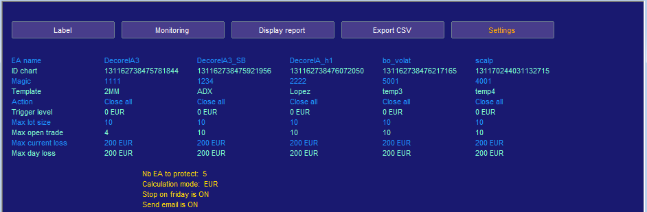 3/ Vous pouvez paramétrer plusieurs types de déclencheurs, j'entends par déclencheur, la limite au delà de laquelle l'EA/strat s'arrêtera de fonctionner, MAIS elle laissera les 4 autres tourner, tout ne s'arrêtera pas.