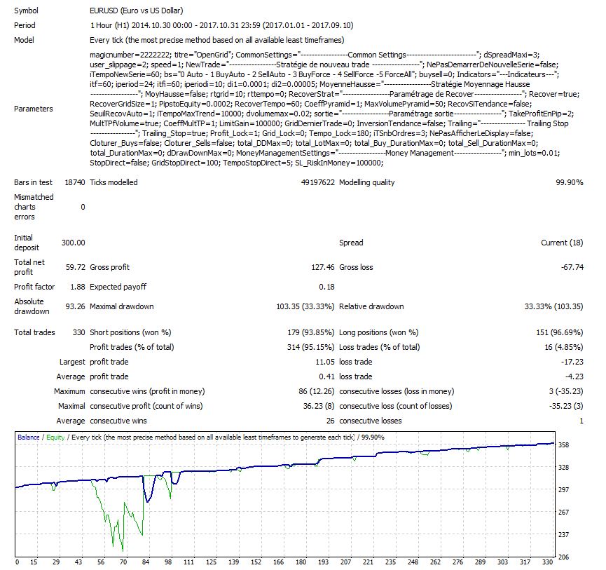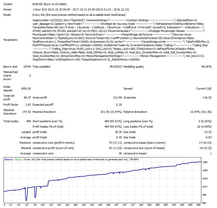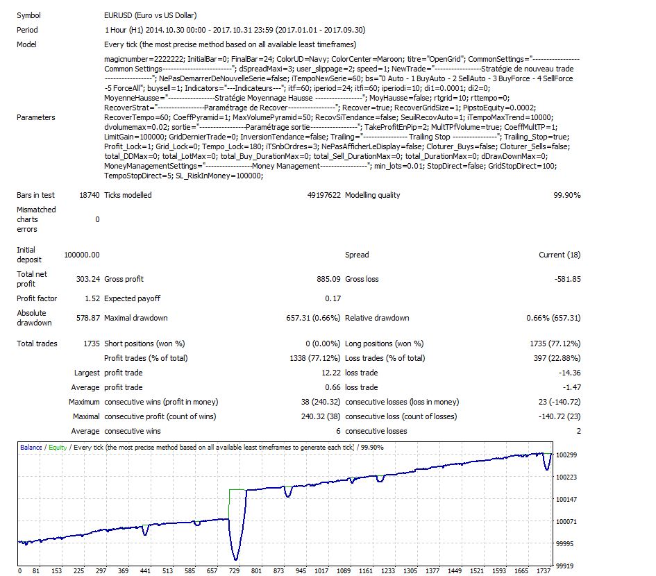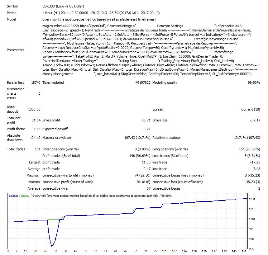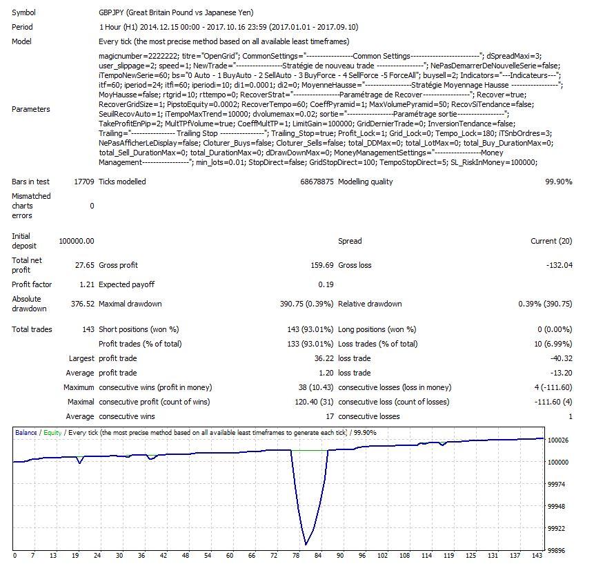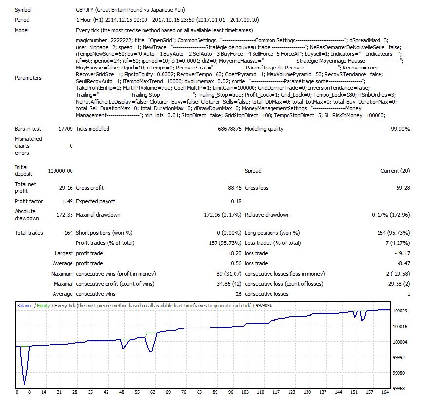 Je note que le nombre de trades gagnants n'est pas forcement le bon car je moyenne à la baisse et clos l'ensemble de la série . En fait le "strategie tester" considère que sur une série de 3 trades seul le positif est considéré gagnant. Peut être devrais je aussi réfléchir à cela ?