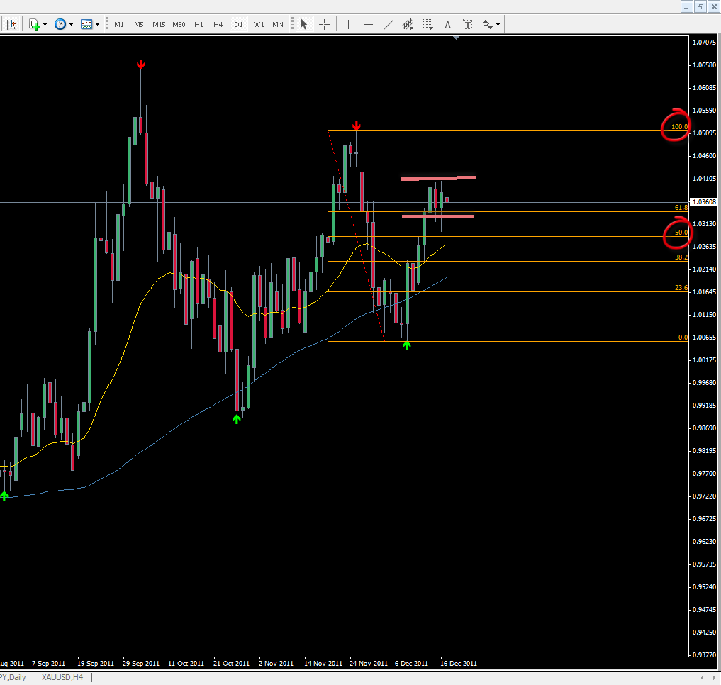 Pour du moyen terme, et là je suis plus confiant, prise de position sur cassure à la hausse du triangle, sl sous les plus bas du 8 décembre (1.0040 par exemple) et tp au niveau des 38.2% de retracement de la dynamique baissière observée depuis mars 2009 (1.079).