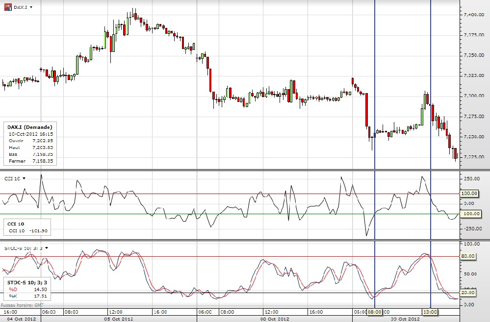En données quotidiennes, l’indice parisien évolue dans range long terme dont la borne haute correspond directement au retracement de Fibonacci à 61.8 % du précédent mouvement baissier, testé à 2 reprises (voir graphique). A moyen terme, j’identifiais une configuration graphique en tête-épaules, en cours de formation, plaidant pour une baisse imminente des cours finalisant de ce fait cette figure chartiste assez rare. A plus court terme, le rallye haussier de la semaine dernière, suivi par le repli de vendredi sous le niveau constitué par l’épaule de gauche, laissait présager une phase de baisse en début de semaine, renforcé par le récent contexte économique décrit précédemment (voir analyse fondamentale). Dans la continuité de la séance baissière de vendredi, je shortais donc le CAC dès le début de l’épreuve sur un échec au franchissement de moyenne mobile exponentielle à 50 périodes sur un graphique 15 min et un croisement baissier des stochastiques survenu au-dessus du niveau 80. J’ai placé ensuite deux ordres limites de ventes en cas de hausse des cours, le premier sur l’épaule de droite, le second sur la tête. Au-delà, mon scénario serait invalidé.
