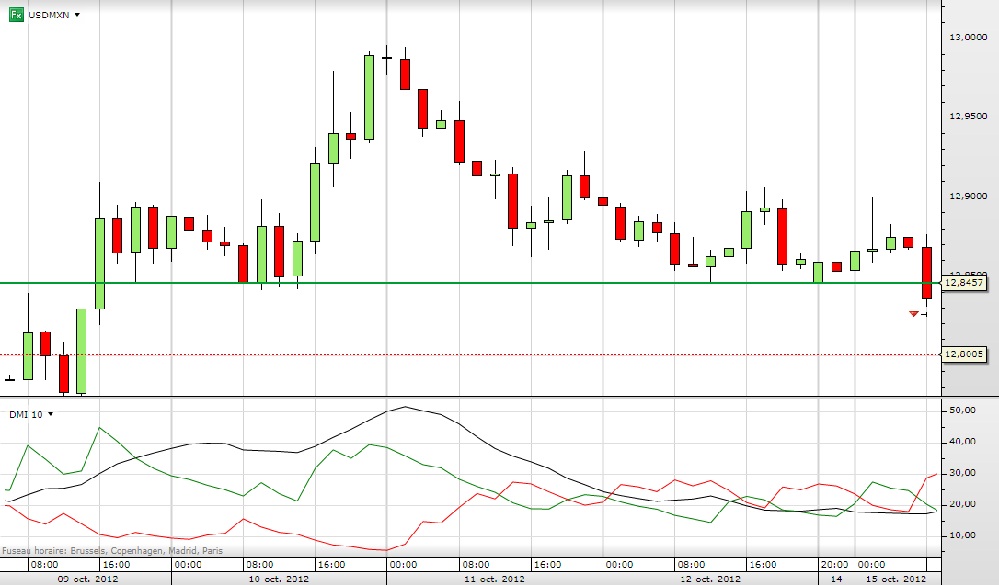 o J’applique ensuite mon algorithme à toutes les paires sélectionnées. Son rôle est de suivre les variations du cours et de surveiller un panier de plusieurs indicateurs. Parmi, ceux-ci, on peut compter le RSI, les stochastiques, le CCI, le DMI, etc… Chacun d’eux est connu pour fournir, selon sa configuration un signal d’achat ou de vente (ex : le RSI franchissant le niveau 70 depuis le haut s’apprécie comme un signal de vente). L’algorithme se nourrit également des niveaux de supports et résistances calculés par un autre robot. Lorsque le système détecte au moins 2 signaux concomitants issus de 2 indicateurs différents, il émet une alerte visuelle et sonore (accessoirement par mail). Pour illustrer cela, reprenons l’exemple de USDMXN : dans la matinée de lundi, peu après le début de la compétition, mon système m’alertais sur cette paire, m’indiquant la cassure d’un support important confirmée par le croisement de DI+ et DI-, interprété comme un signal de vente (voir graphique joint). Je shortais donc la paire.