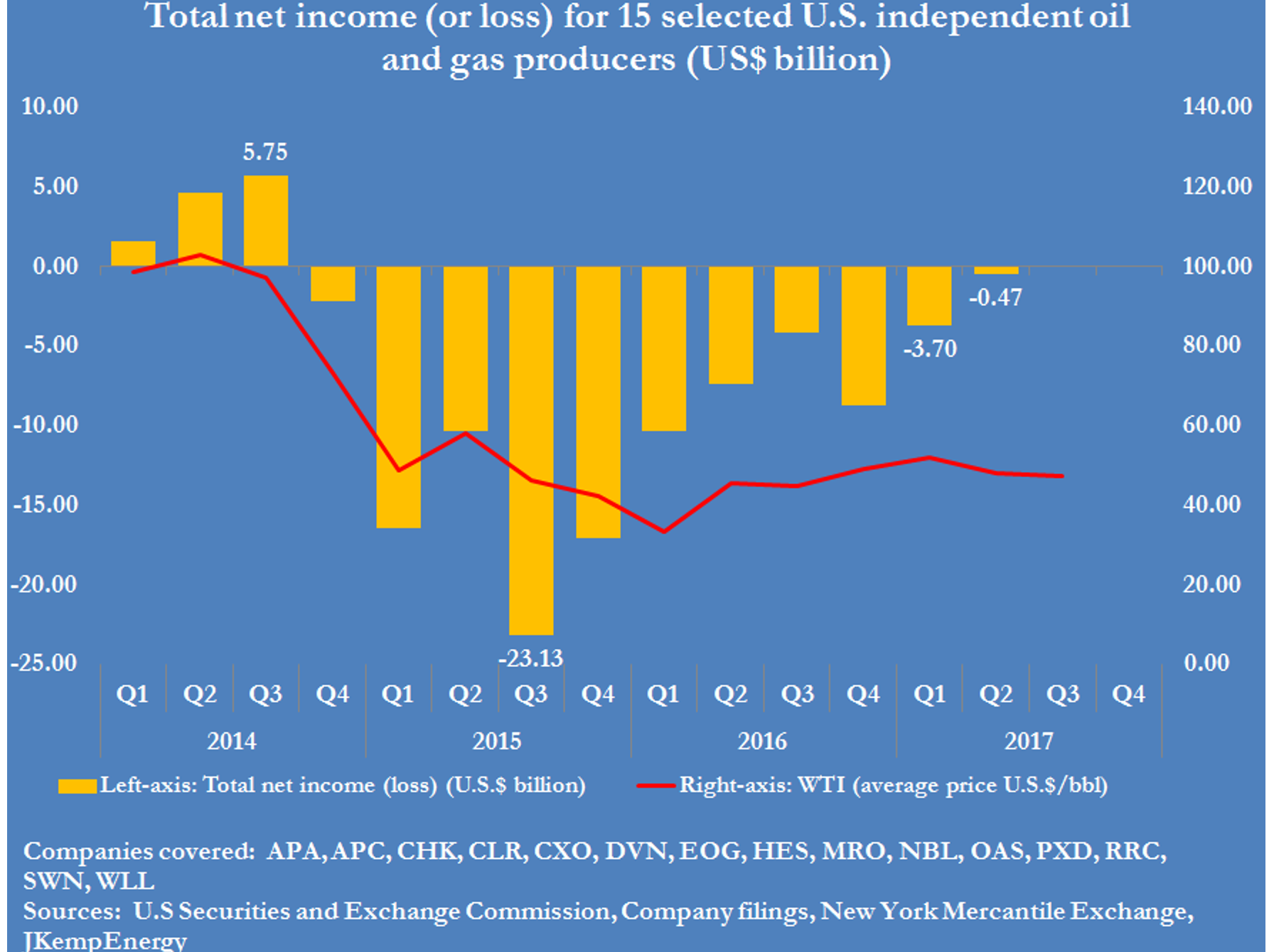 Revenus nets de 15 producteurs indépendants de pétrole et de gaz en fonction du cours du WTI.