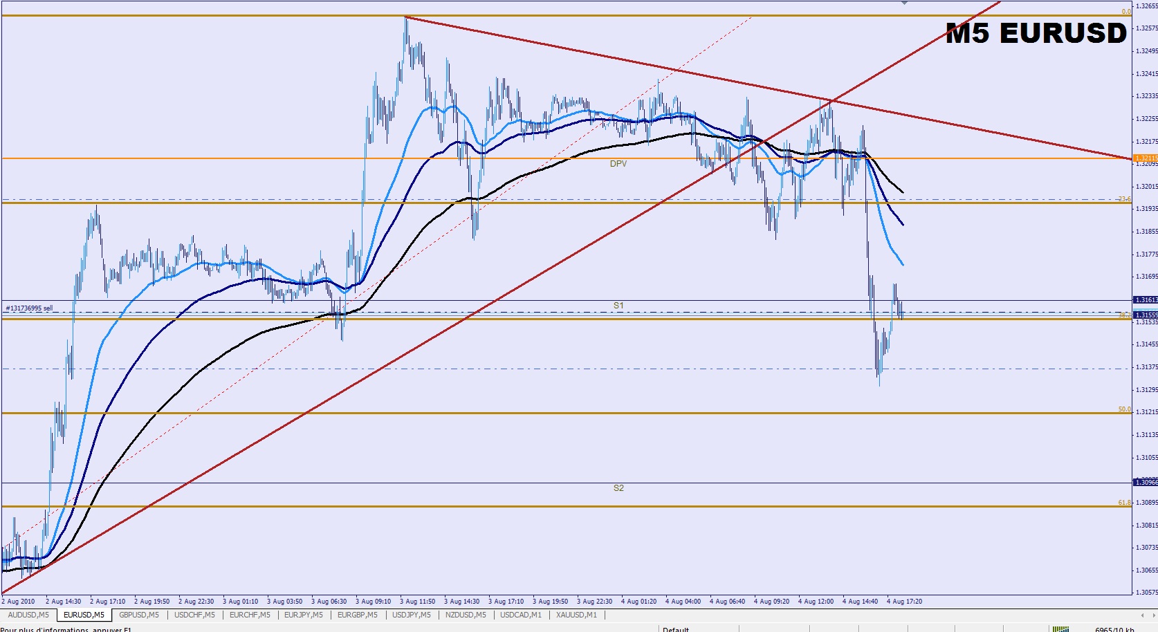 Short sur EUR/USD en graphique 5 minutes pour viser le retracement de 50% de la tendance haussière observée du 30 juillet au 3 aout.