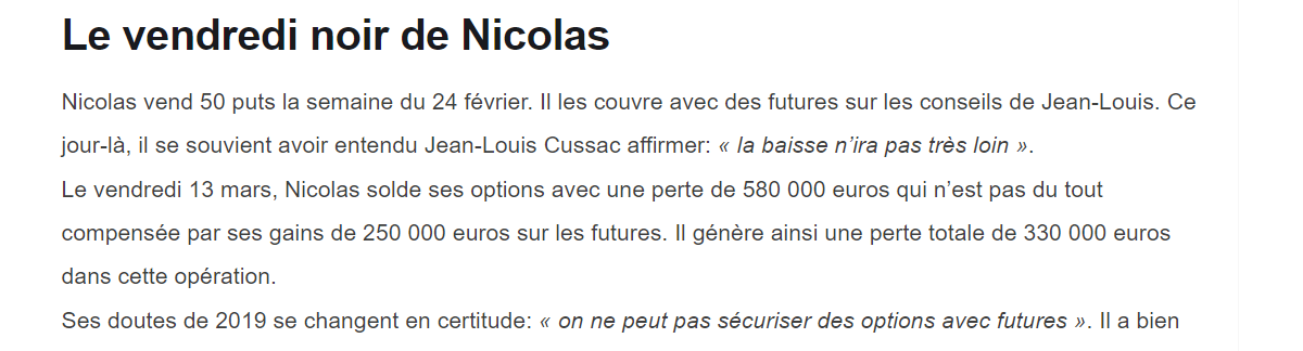 ACHAT d' options = risque connu a l 'avance ( primes) ce qui n'enlève en rien un gros potentiel de gain ( mon exemple plus haut en 24 heures achat d 'option PUT cac échéance juin payer 42 € ( quotité 10 sur cac) , performance de 2000 % trade cloturer a 1000 € ( avant frais courtage) .Dans l 'image çi dessous Nicolas a pris le role d 'assureur en étant VENDEUR option est en + avec 55 LOTS! Sa couverture sur future n'a pas suffit , bien sur puisque la valeur d' un point sur future est fixe mais pas sur les OPTIONS .Je n'aurais jamais pensé que avec une dépense de 42 € j'aurais gagné 1000 € en UN JOUR! On ne controle PAS la volatilité ( qui impact le prix de l 'option)! AVEC L achat d 'options on controle la perte maximum MAIS pas le gain .Avec la vente d OPTION la prime reçu est connu a l avance mais pas LA PERTE!!