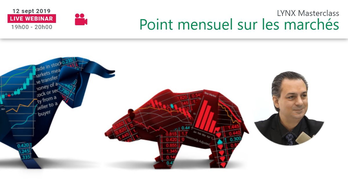Point Mensuel sur les Marchés : Septembre - LYNX Masterclass avec Benoit FERNANDEZ-RIOU Dans ce webinaire récurrent, nous ferons le point en détail sur les marchés financiers. Suite à une analyse approfondie, nous envisagerons des perspectives et des opportunités sur un horizon swing trading. Au cours de ce webinaire y seront abordés les principaux indices (CAC, DAX notamment), les devises majeures (Dollar, Euro, Sterling, Yen…) et selon l’actualité certaines paires exotiques et commodities.