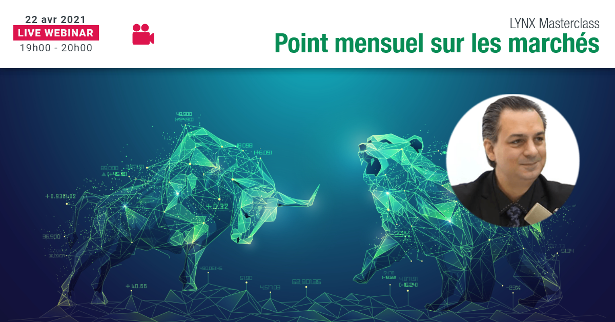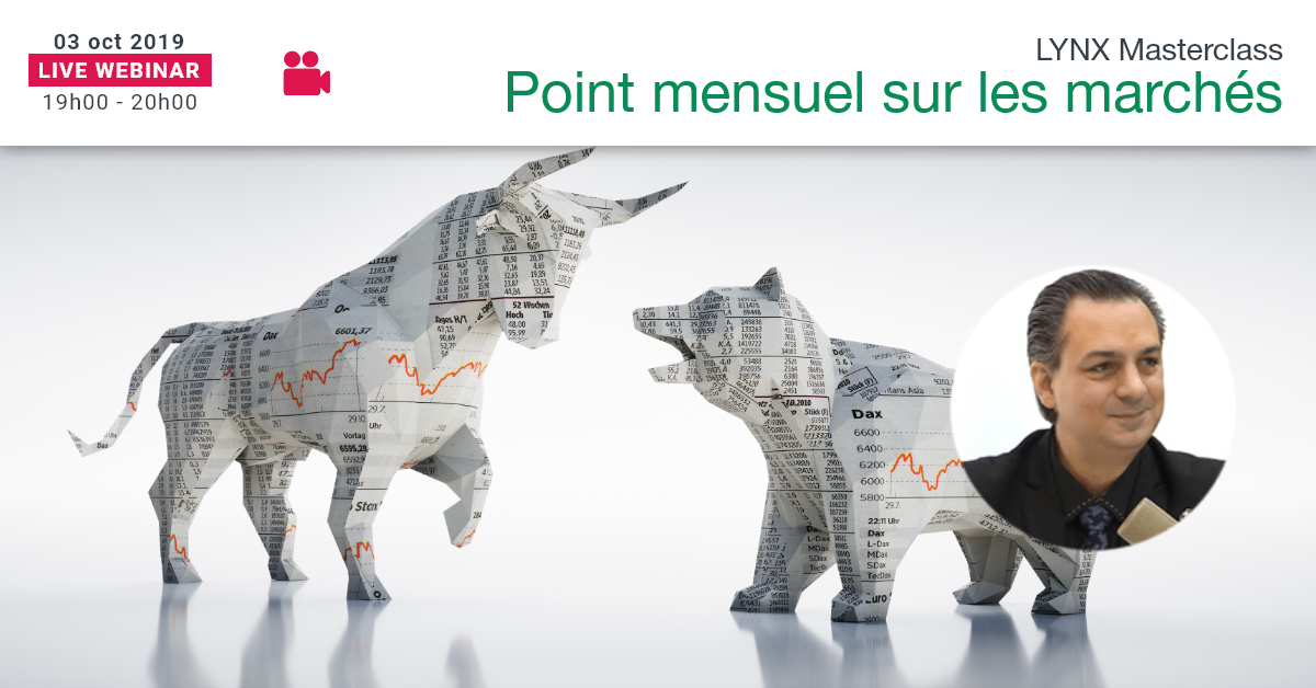 LYNX Masterclass - Point mensuel sur les marchés : Octobre Dans ce webinaire récurrent, nous ferons le point en détail sur les marchés financiers. Suite à une analyse approfondie, nous envisagerons des perspectives et des opportunités sur un horizon swing trading. Au cours de ce webinaire y seront abordés les principaux indices (CAC, DAX notamment), les devises majeures (Dollar, Euro, Sterling, Yen…) et selon l’actualité certaines paires exotiques et commodities.