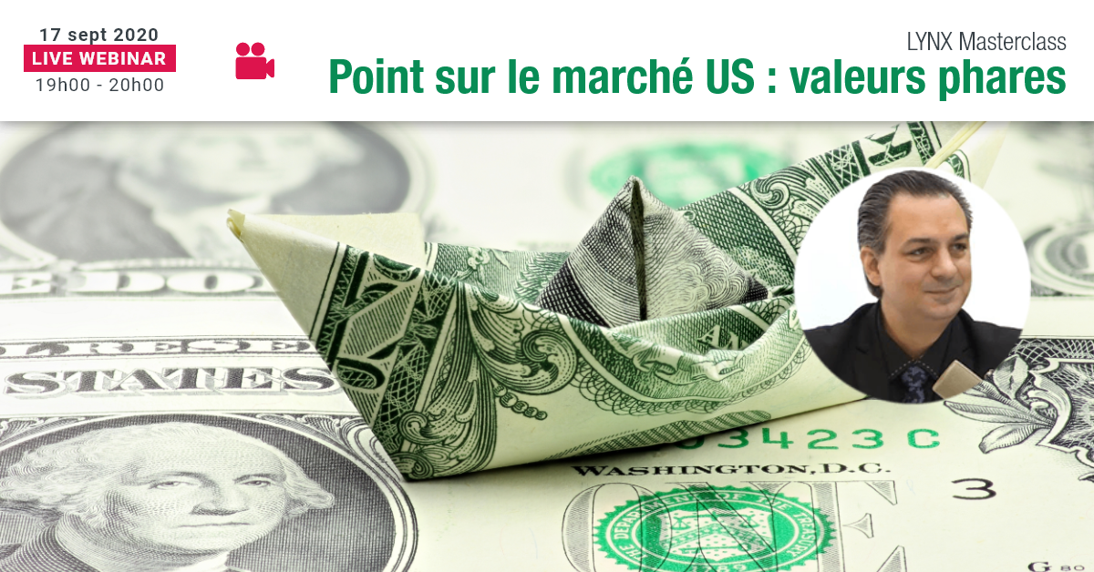 LYNX Masterclass jeudi 17 septembre à 19h : A un mois et demi des élections américaines nous ferons le point sur le marché US et un focus sur les valeurs phares du Dow Jones, Nasdaq et SP500.