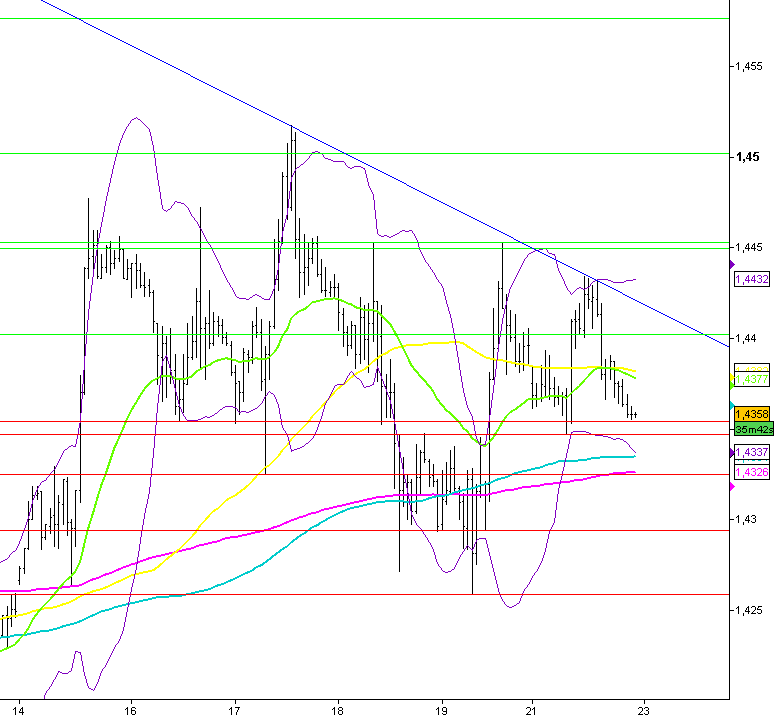 En dépassement des 1,4452 $ retour haussier vers 1,4495 $ voir 1,4520 $, plus haut possible accélération jusqu'à 1,4575 $. Retour baissier sous les 1,4400 $ vers les 1,4350 $, plus bas des 1,4345 $ direction 1,4310 $.